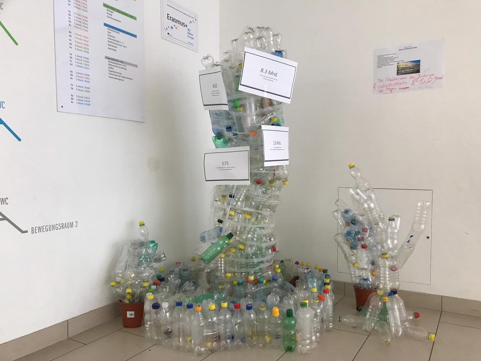 Wir, die Biologie-Wahlpflichtfachgruppe, wollten diesen Umstand nicht länger hinnehmen und haben uns entschlossen, im Rahmen eines kleinen Projektes die Jugendlichen in unserer Schule auf dieses Problem hinzuweisen. Hierfür haben wir diese 575 Plastikflaschen eingesammelt und als Skulptur in der Aula ausgestellt. Zusätzlich sollen die im Schulhaus ausgehängten Plakate mit Fakten und Zahlen dem Betrachter vor Augen führen, welche Ausmaße unser Plastikkonsum mittlerweile angenommen hat und wie wir dem entgegenwirken können.
