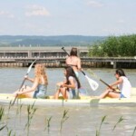 Nach einer Zugfahrt, bei der wir uns sehr aneinander kuscheln mussten und großteils am Boden des Waggons saßen, kamen wir endlich im Strandbad in Weiden an. Bald darauf hieß es: Ran an die Paddel! Einige versuchten sich im Stand-up-Paddeling und machten dabei eine sehr gute Figur, andere bekamen alleine bzw. zu zweit oder zu dritt ein Boot und paddelten damit am See. Der Spaßfaktor kam auf keinen Fall zu kurz! Nach ein wenig Fußball bzw. Volleyball spielen und einer kleinen Abkühlung im See fuhren wir wieder zurück nach Wien. Die Zeit verging wie im Flug und wir wären gerne noch länger geblieben.