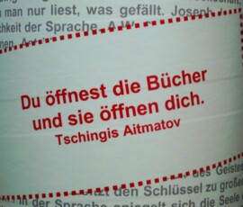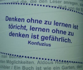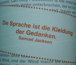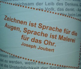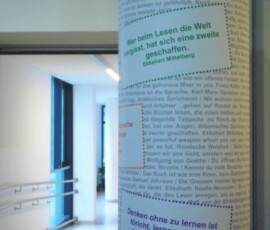 Textkompetenz und Sprachbildung ist seit vielen Jahren ein wichtiger Bestandteil des Unterrichtes in allen Gegenständen am Diefenbach Gymnasium. Dafür wurden die alle Lehrerinnen und Lehrer unserer Schule in vielen Fortbildungsveranstaltungen über Jahre speziell auf dieses Thema geschult. Dieser Schulschwerpunkt ist jetzt mit Sprüchen unter anderem von Ingeborg Bachmann, Voltaire und Ludwig Wittgenstein dauerhaft im Schulhaus auf einer Litfaßsäule sichtbar.