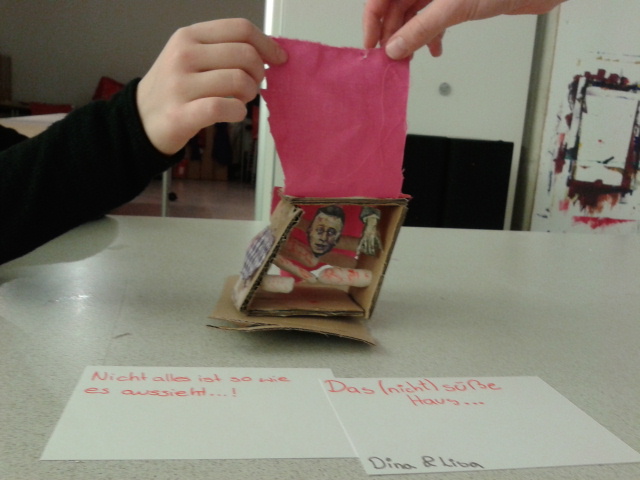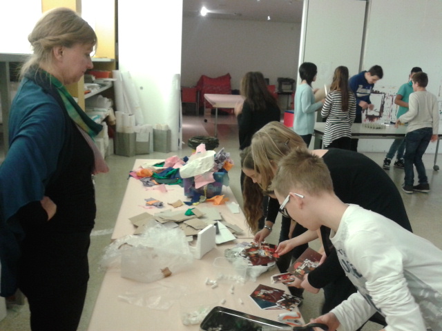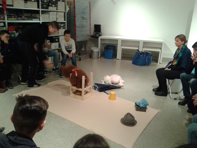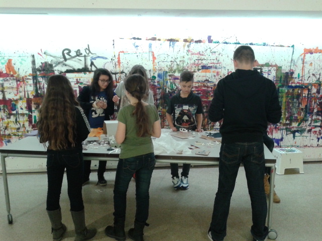 Wir gingen in ein Atelier. Dort mussten wir dann auf kleine Kärtchen unseren Namen schreiben. Esther sagte, wir sollen nacheinander Sachen, wie z.B.: einen Federballschläger, einen Teddy, usw.. auf ein begrenztes Feld legen (man konnte auch die Position der Sachen verändern, die die Personen vor uns hingelegt hatten). Daraus entstand ein Bild.