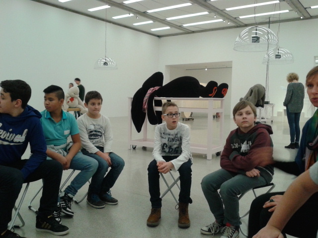 Dann teilten wir uns in zwei Gruppen, die einen gingen mit Esther mit und die anderen mit Tina. Wir schauten und die Ausstellung Cosima von Bonin an. Wir besuchten eine Ausstellung, in der ganz viele bekannte Figuren zu sehen waren, wie z.B.: Bart Simpson oder Duffy Duck.