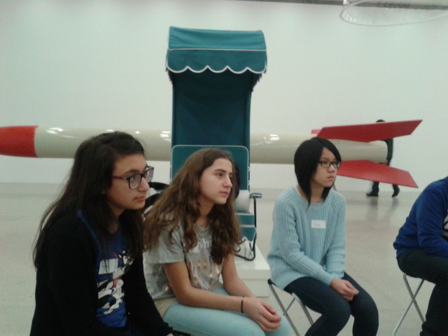 Dann besuchten wir eine andere Ausstellung, in der ein Kartonauto ohne Türen zu sehen war oder Küken auf Raketen saßen. Dann gingen wir wieder ins Atelier zurück; dort bekamen wir zur Stärkung Saft und Äpfel.