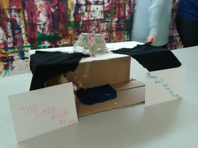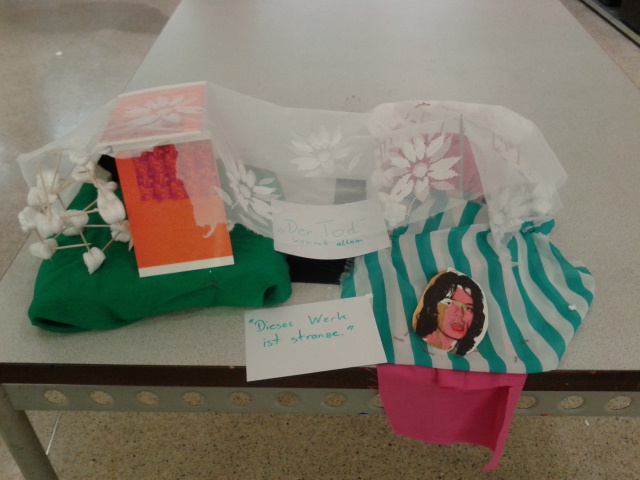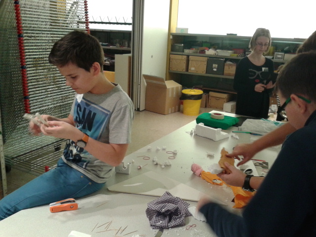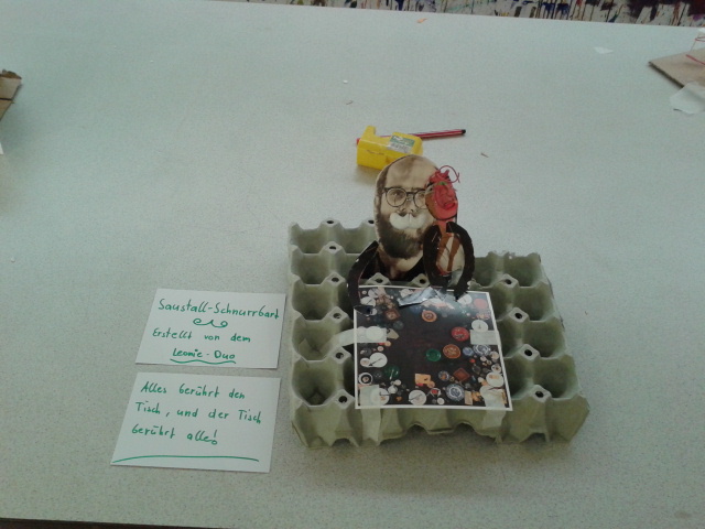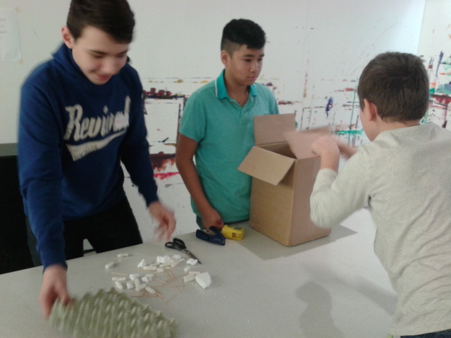 Danach ging es schon wieder weiter. Wir mussten aus verschiedenen Materialien ein Kunstwerk bauen. Dafür mussten wir uns in Zweier bzw. Dreiergruppen zusammenschließen. Es kamen dabei ganz lustige Sachen heraus.