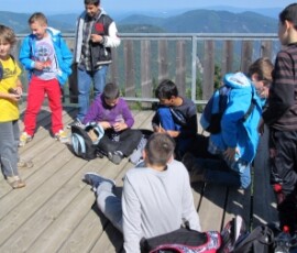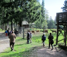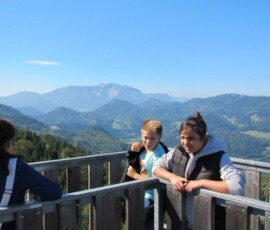 Von der Schule fuhren wir mit einem Bus bis zum Parkplatz beim Naturparkgehege auf der Hohen Wand. Dort stiegen wir aus und wurden in zwei Gruppen eingeteilt. Wir gingen mit einem Führer ca. 1 Stunde den Berg hinauf. Dabei haben wir viele Felder und verschiedene Arten von Bäumen gesehen. Der Weg war ziemlich beschwerlich, weil es einmal bergauf und dann wieder einmal bergab ging. Er war auch beschwerlich, weil es viele kleine Steine gab und es sehr rutschig war. Auf dem Weg zum Skywalk sind wir an einem Gehege mit Rehen und Hirschen vorbeigegangen. Wir haben gesehen wie die Tiere gefüttert wurden und haben auch noch erfahren, dass in dieser Zeit die Männchen um die Weibchen kämpfen, und dass das ungefähr noch 2 Wochen andauert. Beim Skywalk angekommen hatten wir eine schöne Aussicht auf Felder, Dörfer und die umliegenden Landschaften. Manche Kinder hatten Höhenangst und trauten sich nicht auf den Skywalk. Als ich die schöne Aussicht fotografieren wollte, hatte ich ein wenig Angst, dass mir mein Handy hinunter fällt.