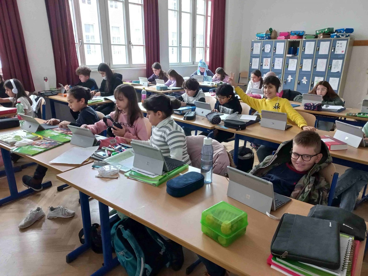 Pupils in class 1c do online exercises on their tablets, they also write short texts and upload them to our learning platform. They can also take pictures of assignments and upload them if required.
