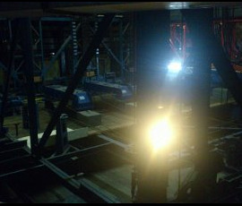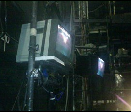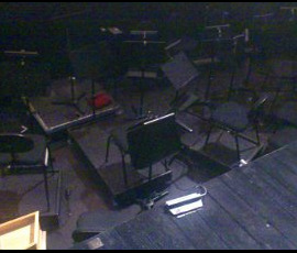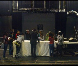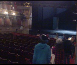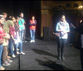 Die Führung ging weiter: Wir betraten die Bühne, um den Zuschauersaal einmal aus der Sicht der Schauspieler kennen zu lernen. Als wir auf der Bühne waren, hat uns Herr Wagner über die auf den Dirigenten gerichtete Kamera, die von uns gezeigt wurde, aufgeklärt: Der Dirigent wird gefilmt, damit die Schauspieler aus ihrer Position ihn auf einen Monitor sehen und nicht immer nach vorne schauen müssen, was das Schauspiel beeinträchtigen würde. Frau Prof. Intzés überredete Herrn Wagner uns zu gestatten, auf der Bühne zu singen. Das hat mich persönlich ziemlich begeistert, denn die Akustik im Saal ist großartig und wir konnten uns ein Bild vom Job der Schauspieler machen.