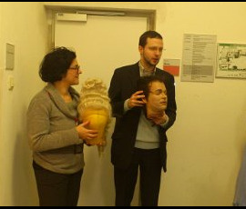 Auch die Unterbühne wurde uns Vorgestellt und wir konnten einen Blick auf das Gestell der 70 Jahre alten und 200 Tonnen schweren Drehhebebühne werfen, die sich mit 4 km/h bewegt und von welcher es in Österreich nur zwei gibt, die zweite Drehhebebühne befindet sich in Linz. Am Ende unserer Führung durften wir Requisiten und Perücken ansehen und anziehen. Das war eins meiner Highlights an diesen Ausflug. Ich hoffe, dass wir eine Tages ein Theaterstück anschauen können. Wie zum Beispiel die aktuelle Barockoper „Radamisto“.