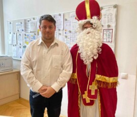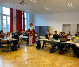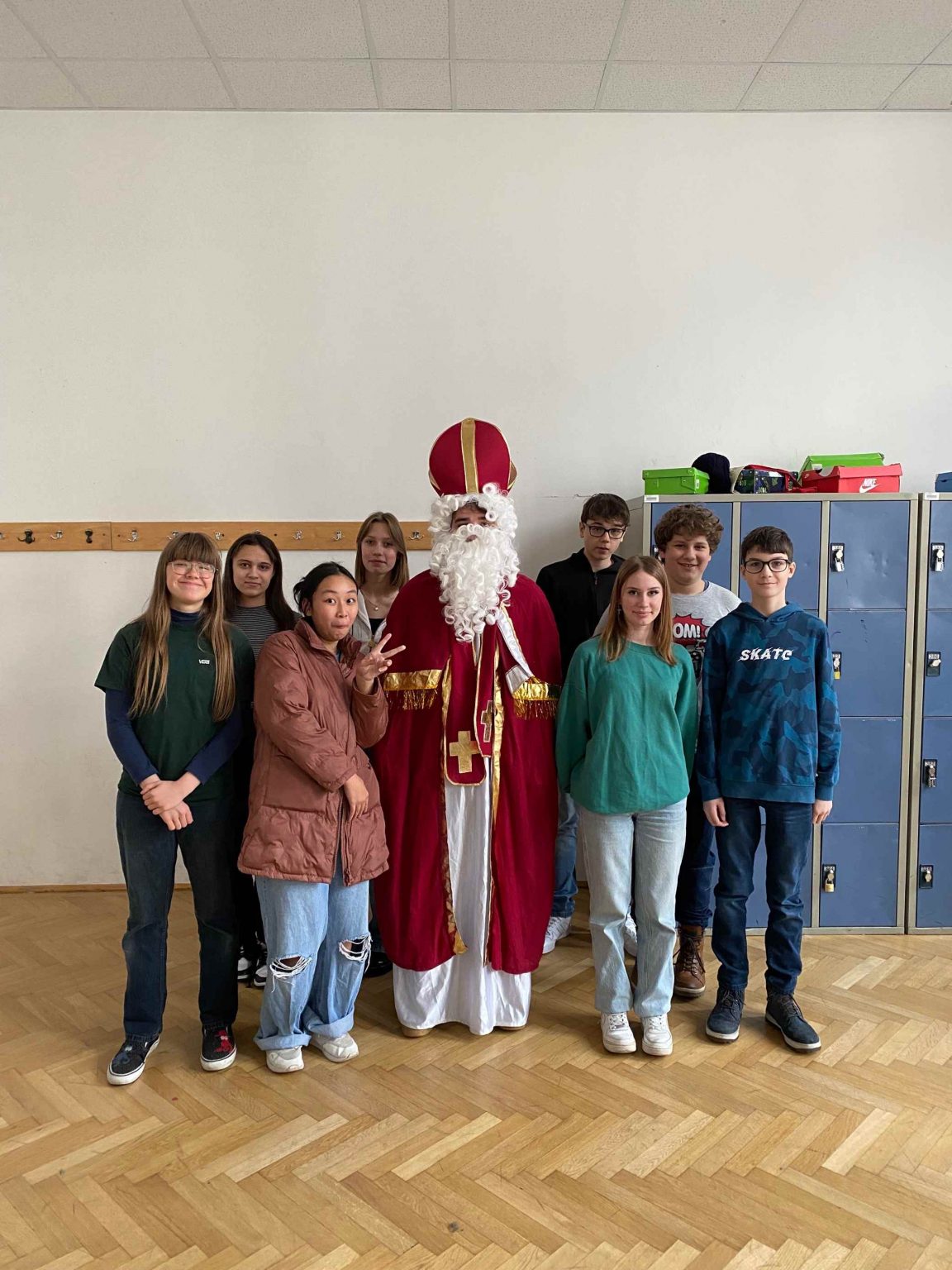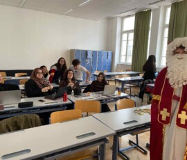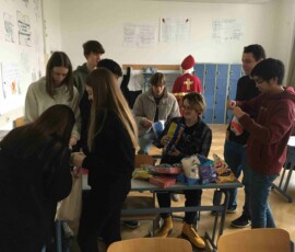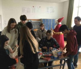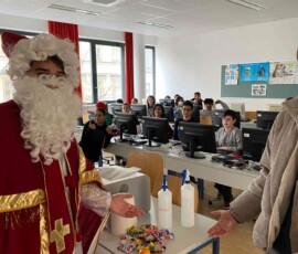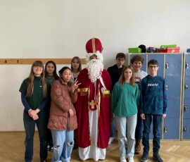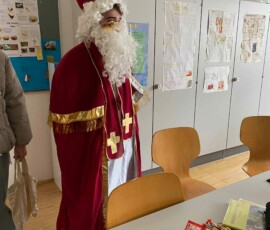 Am 6. Dezember bekamen wir Besuch vom Nikolaus! Ein Schüler der 8. Klasse schlüpfte ins Gewand des wohl beliebtesten Heiligen, um dem Rest der Schule eine kleine Freude zu bereiten. Nüsse, Mandarinen und kleine Süßigkeiten, die vom Elternverein gesponsert wurden, wurden an die vielen braven Schüler:innen der Schule verteilt. Ein herzliches DANKE an den Nikolo und seine Helfer, die ein wenig Freude in den turbulenten Schulalltag brachten!
