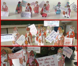 Gleichzeitig ließen einige Schüler:innen im Rahmen der Religionsstunde (katholisch) einige Nikoläuse symbolisch protestieren, um auf die widrigen Umstände aufmerksam zu machen, unter denen Schokonikoläuse immer noch produziert werden. Auch wenn wir uns an den Süßigkeiten freuen, sollen wir auf diese Problematik nicht ganz vergessen!