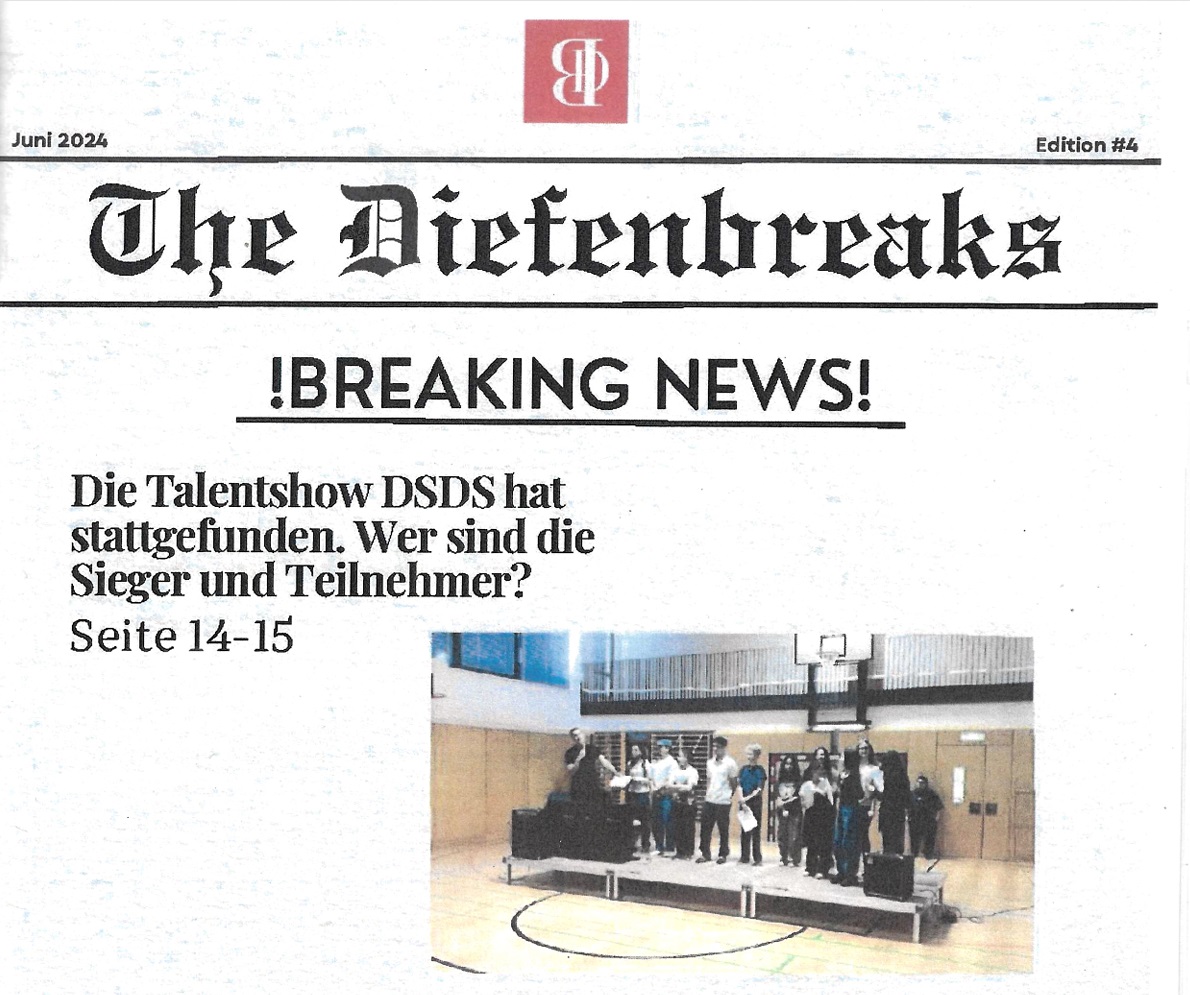 Bei dieser Zeitung handelt es sich um die neuste Ausgabe der Schülerzeitung des Diefenbachgymnasiums vom Juni 2024. Darin findet ihr viele spannende Artikel, dazu Interviews, Film- und Buch-Rezension und noch viel mehr.