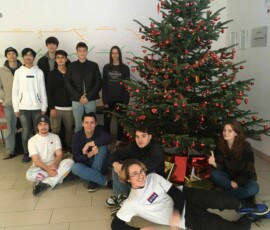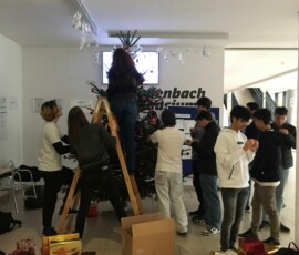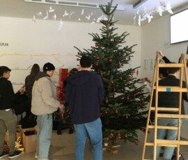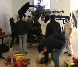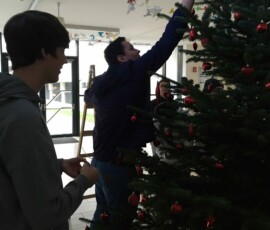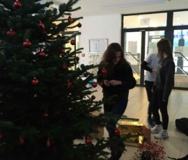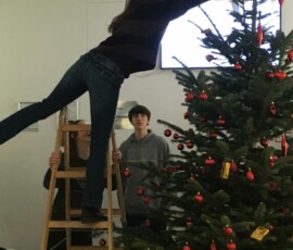 Ich stehe hier im Diefenbach Gymnasium, um ein wenig Glitzer und Weihnachtsstimmung zu verbreiten. Anfangs stand ich nur mit meinen satten grünen Zweigen in der Schule. Am Nachmittag kamen jedoch die katholischen Schüler:innen der 8. Klassen und legten sich so richtig ins Zeug, um mich schön zu schmücken. Sie hingen viele Kugeln auf meine Zweige, umwickelten mich mit Weihnachtsketten und setzten mir auch noch eine Spitze drauf. Ach, wie schön ich doch aussehe! Es hat richtig Spaß mit den Maturant:innen gemacht und ich hoffe, dass ich ganz viele Augen zum Leuchten bringe, wenn man mich sieht.