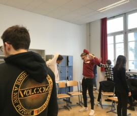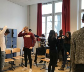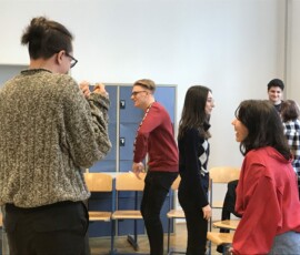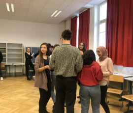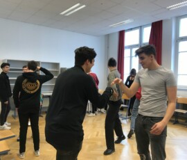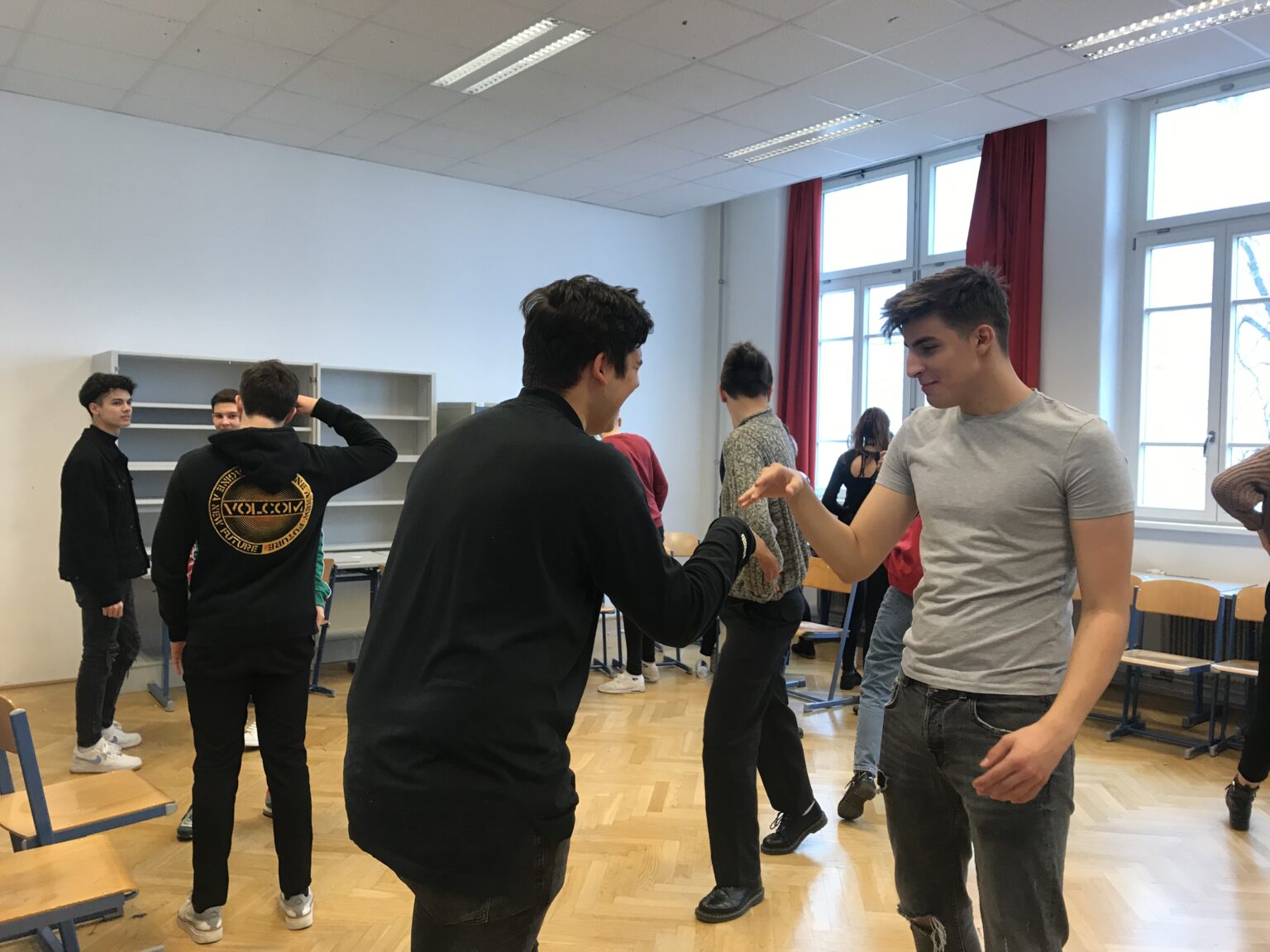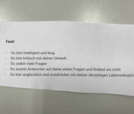 Unsere Workshop Leiterin Anna hat uns interaktiv gezeigt, dass man sogar in ein altes Stück neue, aktuelle Themen einbauen kann, ohne den Inhalt zu verändern. Zuerst haben wir uns vorgestellt und kurze schauspielerische Aufwärmübungen gemacht. Danach haben wir uns in die verschiedenen Figuren aus Goethes „Faust“ hineinversetzt und deren Wünsche vor der Klasse dargestellt. Es wurden auch einzelne Szenen aus dem Stück in ein modernes Theaterstück umgewandelt. Zum Beispiel gab es in Auerbachs Keller statt Wein auch Drogen und gewisse Angebote von Frauen an Faust. Anna hat uns auch erklärt, dass in der neuen Inszenierung, die im Burgtheater gezeigt wird, die Rollen moderner gestaltet wurden, der Inhalt aber trotzdem richtig wiedergegeben wird. Auch interessant war, dass manche „Darsteller“ unserer Klasse im Dialekt – welcher irgendwie das Gegenteil zu Goethes Schreibstil ist – die Szenen geschauspielert haben.