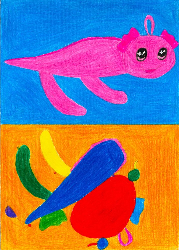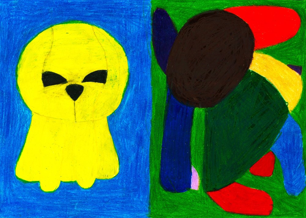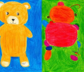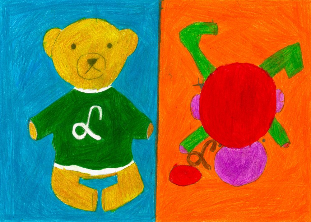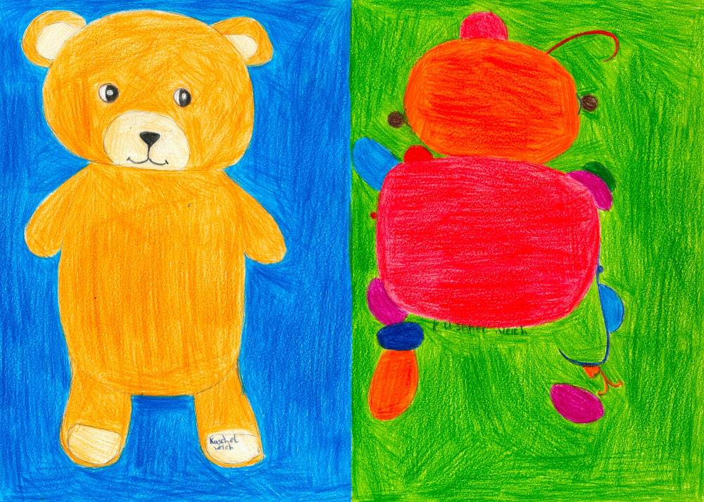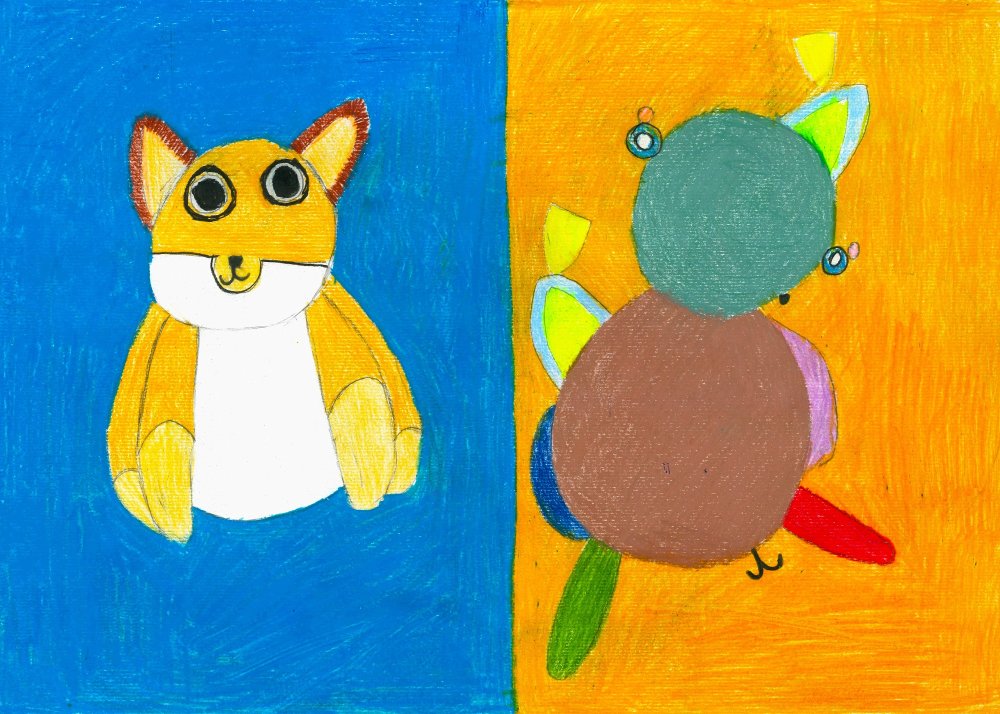 Die Schüler*innen haben sich im Kunst und Gestaltungsunterricht mit gegenständlicher und abstrakter Kunst auseinandergesetzt. Sie haben ein selbstgewähltes Kuscheltier zuerst realistisch abgebildet und anschließend in ein abstraktes Formengebilde umgewandelt.