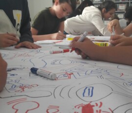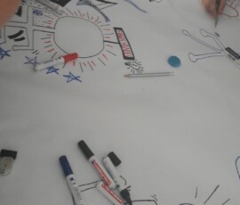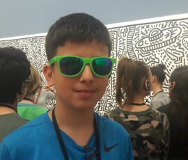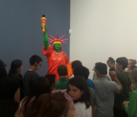 Unsere Führerin teilte uns in Gruppen ein und gab uns Kärtchen mit Dingen, die wir auf den Bildern von Keith Haring wiederfinden mussten. So lernten wir die Bedeutung von UFOS, Hunden, Micky Maus, Hieroglyphen und andern Dingen bei Keith Haring kennen. Zum Abschluss bemalten wir im Atelier eine 10 m lange Papierrolle mit Männchen und Gegenständen, wie sie Keith Haring zeichnet.
