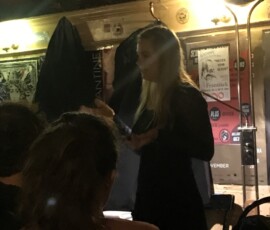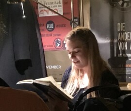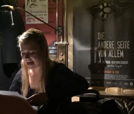Anno – Josefstadt – Wien. Katharina ihr Name. Sie ist freundlich, aufgeregt, heißt alle ZuhörerInnen persönlich in der ihr eigenen offenen, herzlichen Art willkommen. Sie liest amüsante Tagebucheinträge, welche sie auf ihren zahlreichen Reisen verfasst hat. Sie rezitiert selbstverfasste, melodramatische Gedichte. Sie gibt beeindruckende, zum Nachdenken anregende Slam-Texte zum Besten. Sie ist ganz in ihrem Element!