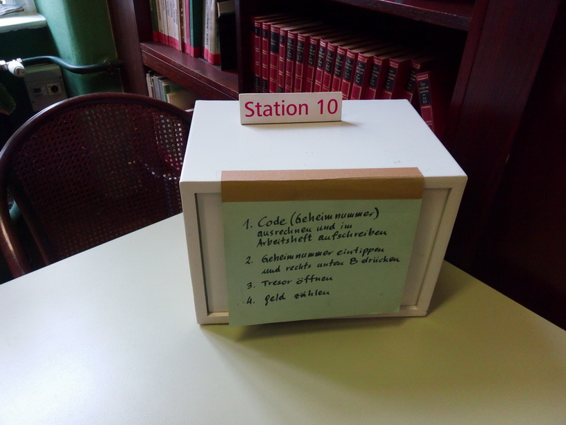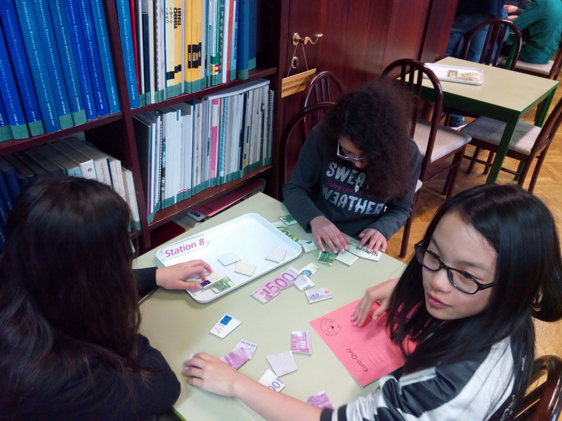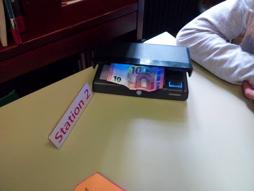 Den Abschluss bildete ein Stationenbetrieb zum Thema Geld und Währung. In der Gruppe, mit einem Arbeitsheft ausgestattet, musste unter anderem gerechnet, ein Tresor geöffnet, mehrere Puzzles gelegt oder Geldscheine mit einer UV- Lampe geprüft werden.
