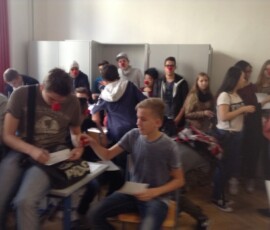 1.er Bezirk. Elf Uhr. Verdammt heiß. Wir sitzen auf einer Bank und machen eine Verschnaufpause, als uns einfällt, wie wir unsere Vorgehensweise verbessern könnten. Anstatt immer in eine Richtung zu gehen, sollten wir doch an einem Punkt stehen und jeden fragen, der an uns vorbeigeht. Dies setzten wir auch in die Tat um! Langsam wird unsere Dose richtig schwer und die „Dankeschön!“ – Sticker sind auch alle. 🙂
