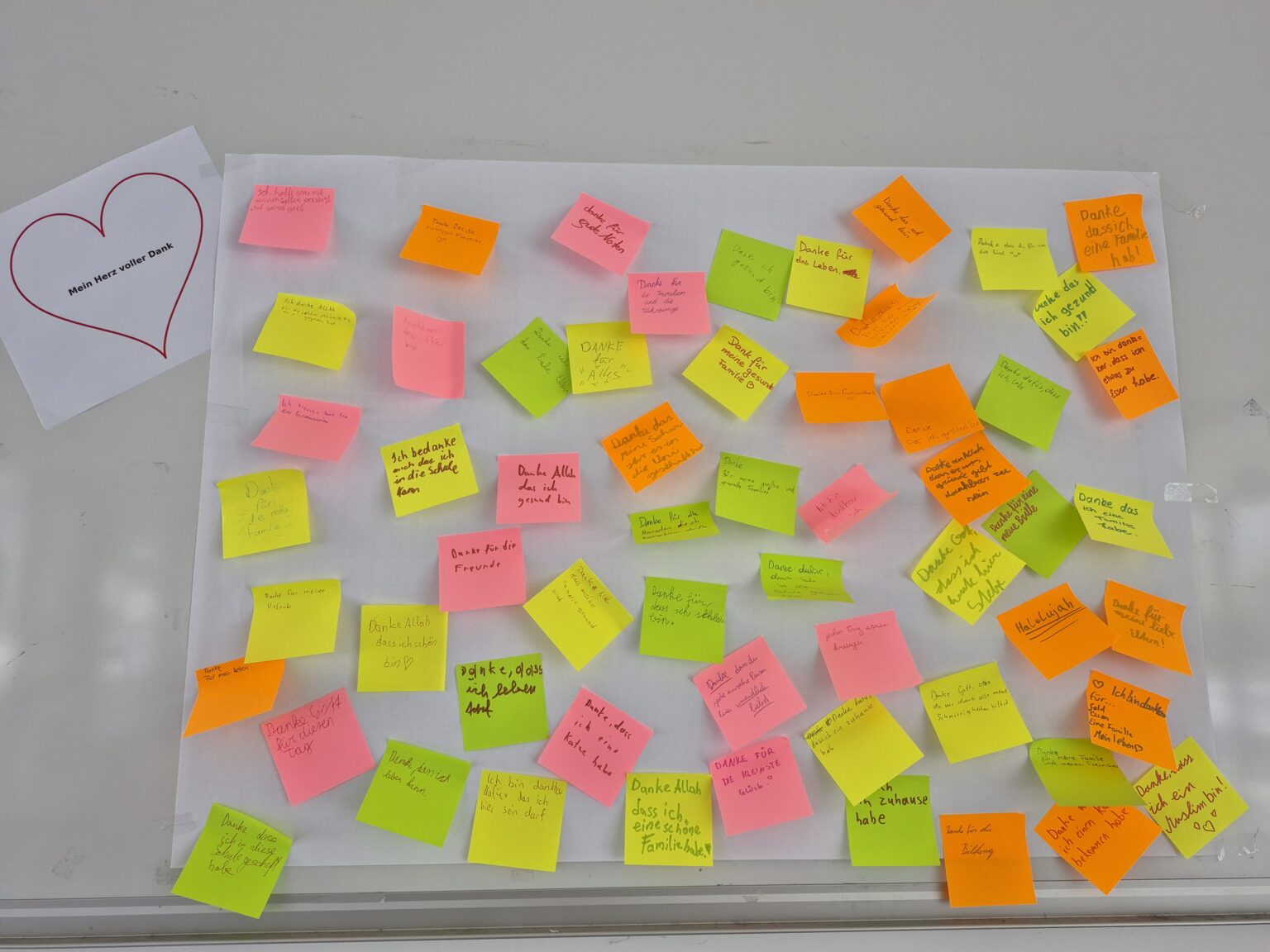 Mit Liedern, kurzen religiösen Texten und Impulsen wurde deutlich, dass Dankbarkeit eine Haltung ist, die Kraft gibt, verbindet und den Blick auf das Positive lenkt. Besonders schön war der Moment, als jede und jeder am Ende der Feier die Gelegenheit hatte, persönliche Dankbarkeitsgedanken aufzuschreiben. Viele bedankten sich für Familie, Freundschaften, Gesundheit oder einfach für die kleinen Dinge des Alltags.