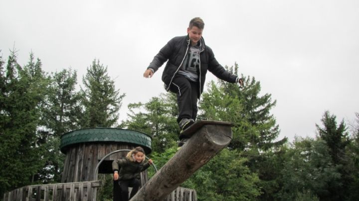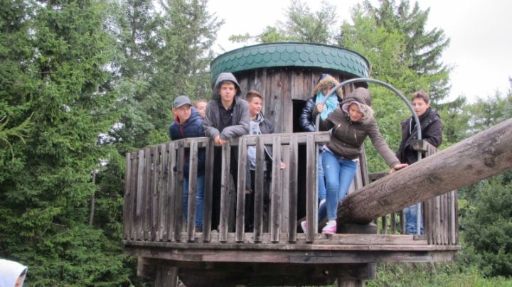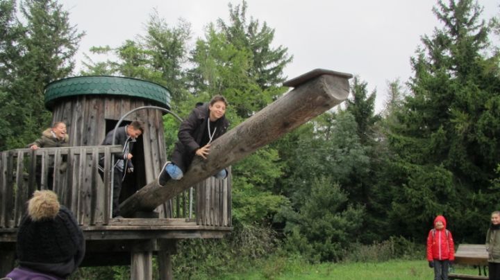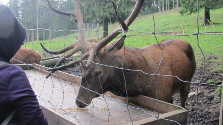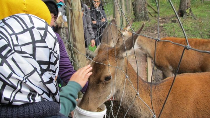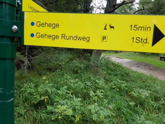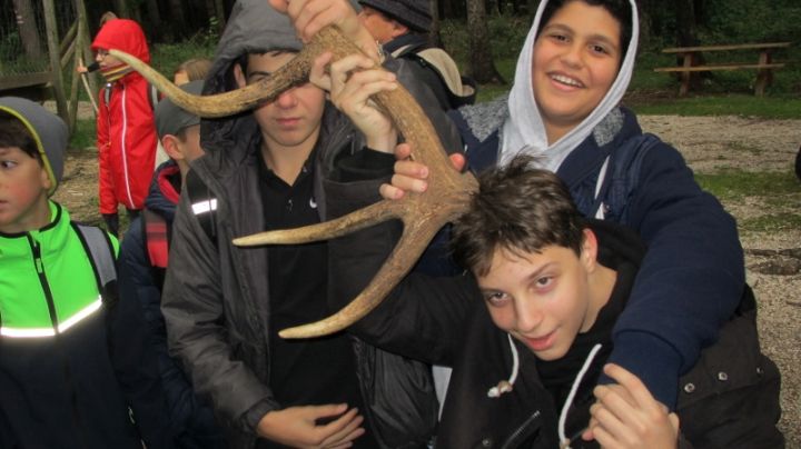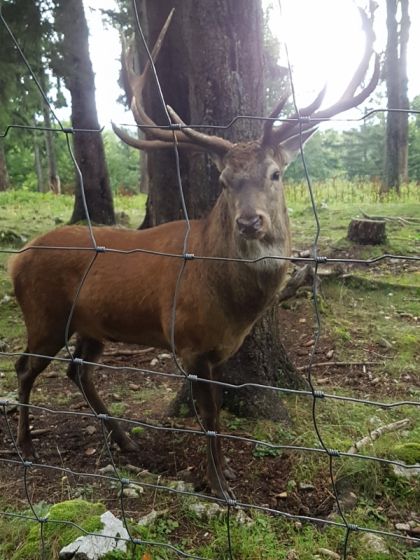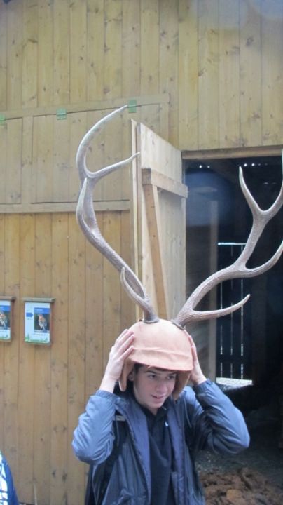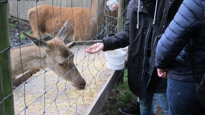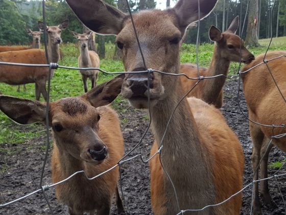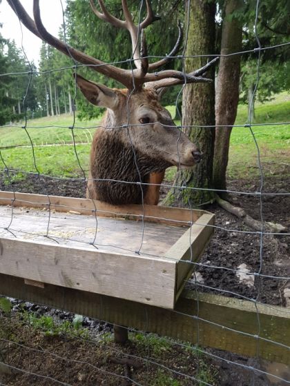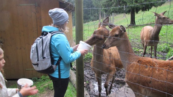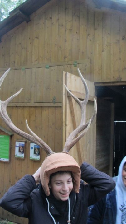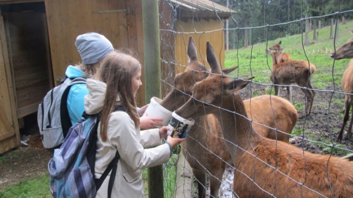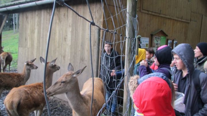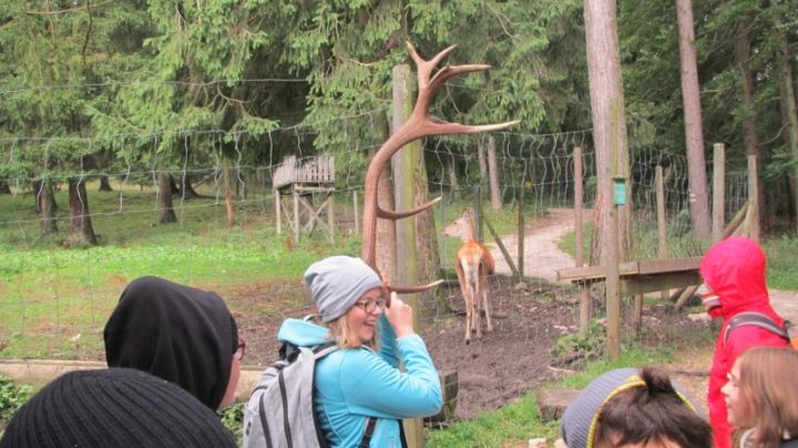 Nachdem sich unsere Führerin bei uns vorgestellt hatte, machten wir uns auf den Weg durch den Naturpark. Nach ein paar kurzen Zwischenstopps bei Spielplätzen und anderen Stationen kamen wir zu einem Tiergehege. Dort durften wir die Tiere füttern und konnten sie von einer Aussichtsplattform aus beobachten. In dem Gehege gab es drei Hirsche und acht Rehe. Wir lernten über die Geweihe und das Verhalten der Hirsche.