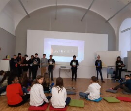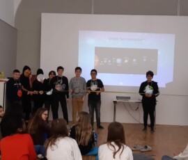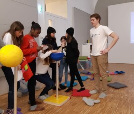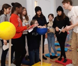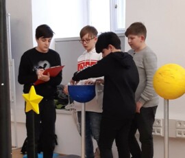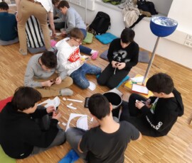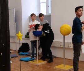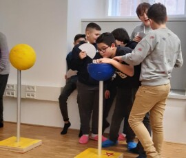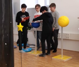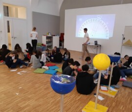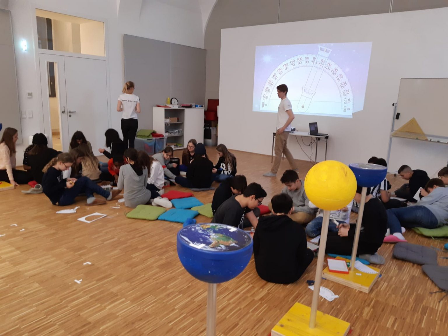Nach der Erkenntnis, dass es viel zu weit ist, um den Abstand mit einem Maßband oder anderen Hilfsmittel zu messen, erarbeiteten die Workshopleiter mit den Schülerinnen und Schüler eine Methode, um die Entfernung herauszufinden. Winkelmesser wurden gebastelt, das bereits erlernte Wissen über Dreiecke angewendet und anhand von Modellen wurde geforscht.